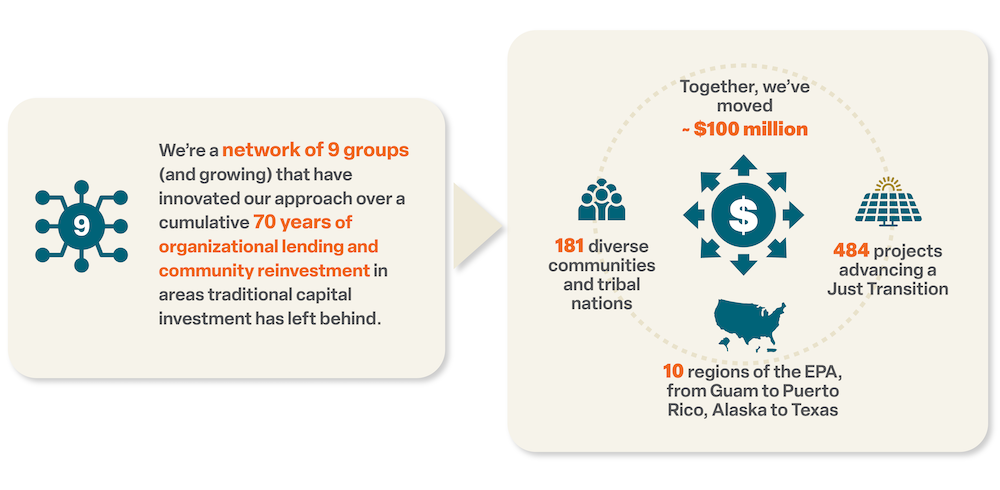 We're a network of 9 groups (and growing) that have innovated our approach over a cumulative 70 years of organizational lending and community reinvestment in areas traditional capital investment has left behind. Together we've moved ~$100 million to 484 projects advancing a Just Transition in 181 diverse communities and tribal nations across the 10 regions of the EPA, from Guam to Puerto Rico, Alaska to Texas.